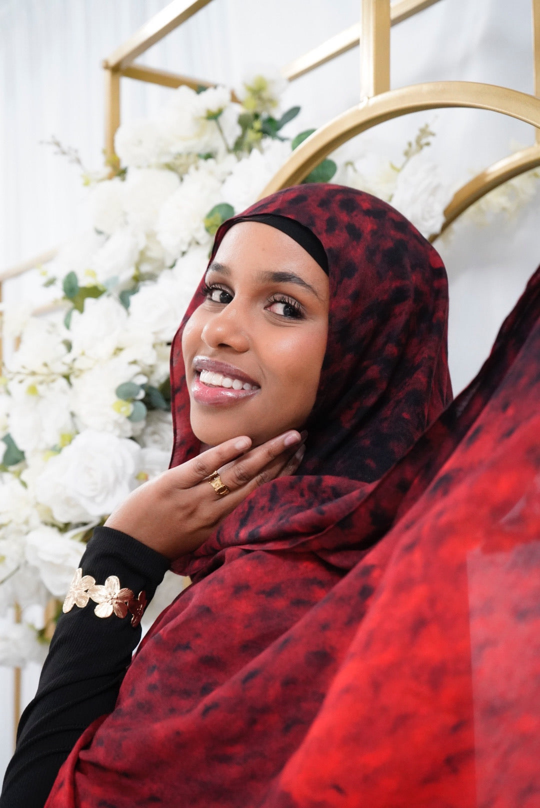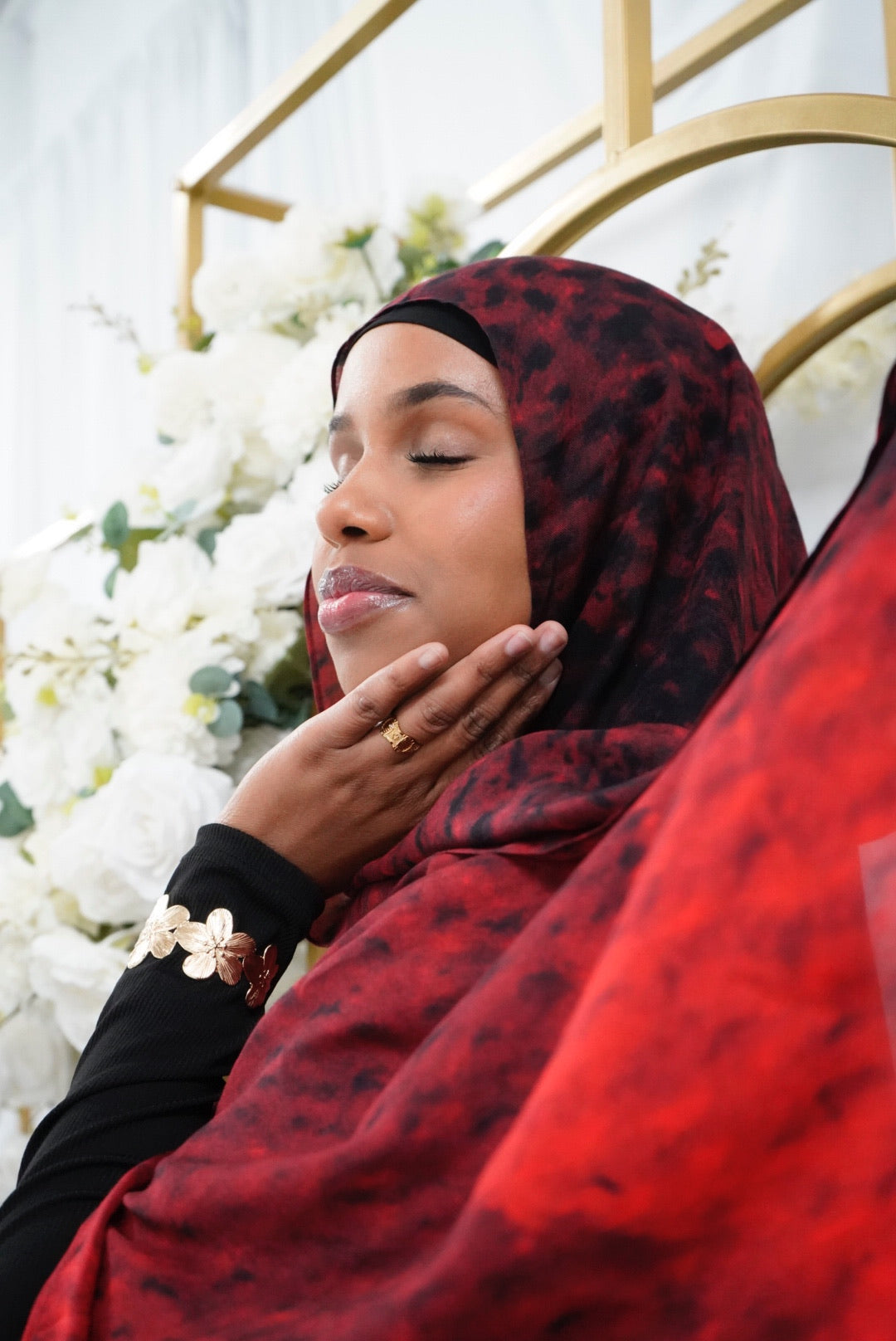 Bold Meets Graceful In Dusky Flame, A Hijab That Captures The Quiet Power Of A Setting Sun. With Rich Crimson Red Melting Into Deep Charcoal Black, This Piece Creates A Dramatic, Smoky Silhouette That’s Equal Parts Fierce And Elegant.