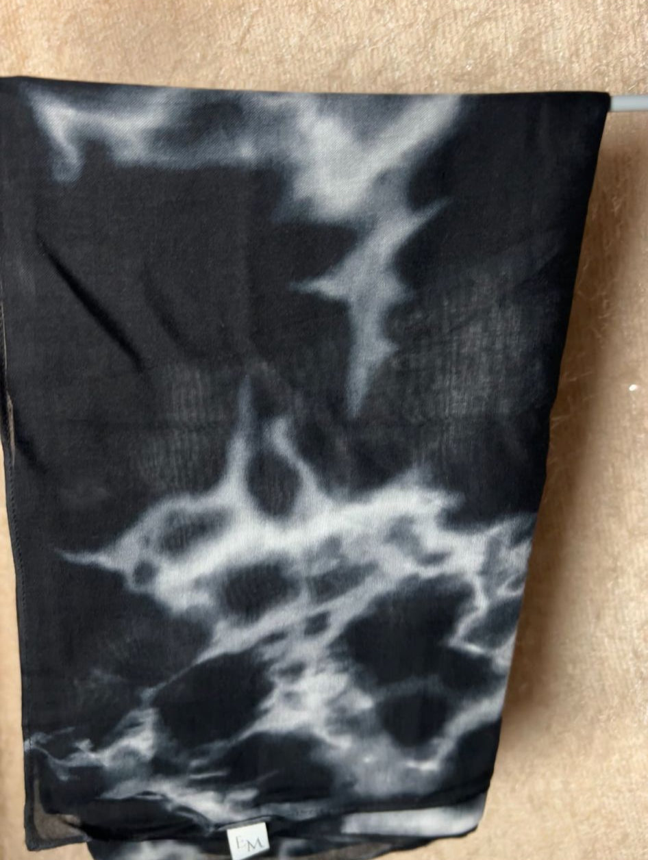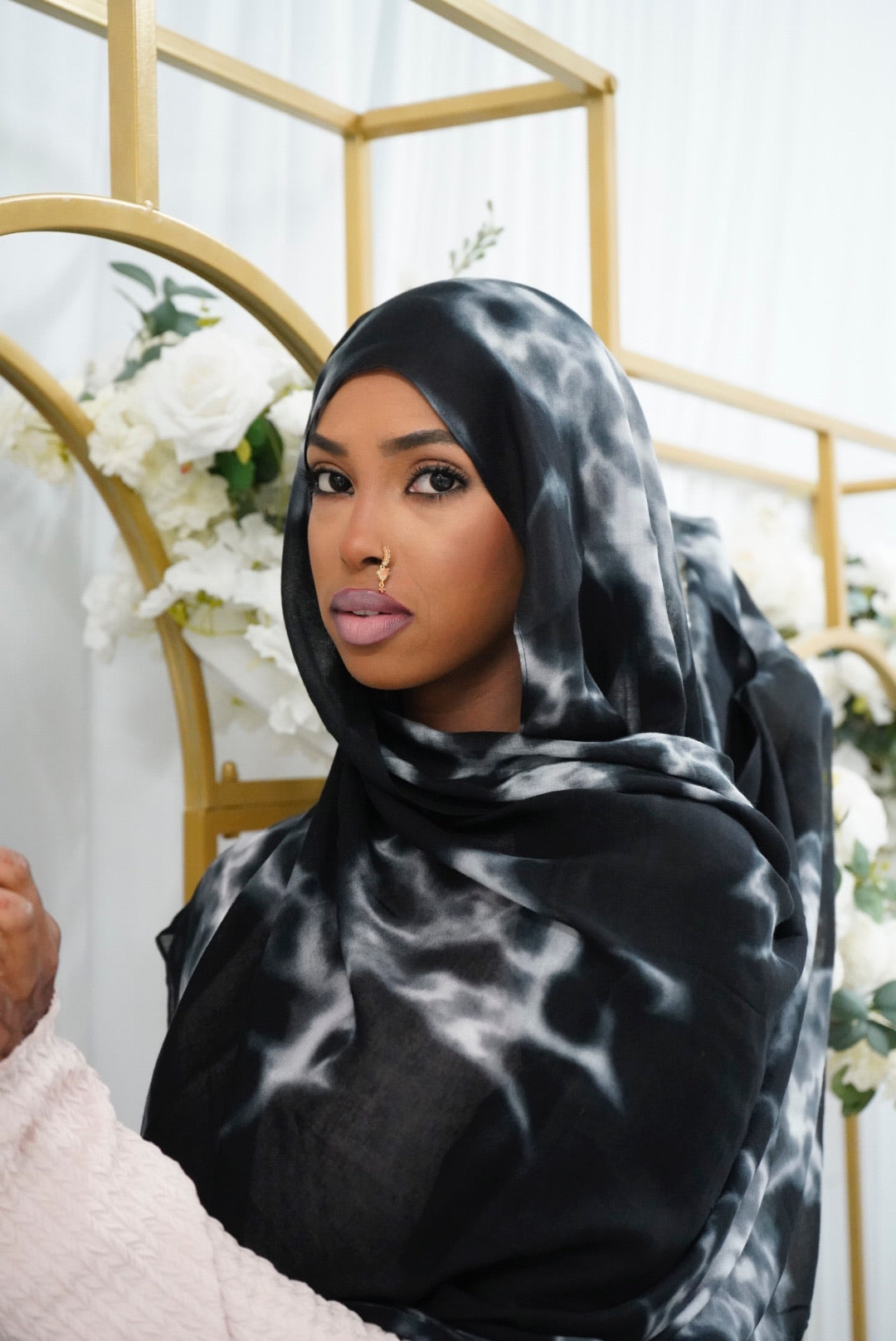 Step Into Your Power With Marble Night, A Hijab That Channels Quiet Strength And Timeless Elegance. Designed With Stormy Black, Smoky Grey, And Luminous White In A Marbled Lightning Pattern, This Piece Is Like Wrapping Yourself In The Mystique Of The Night Sky.