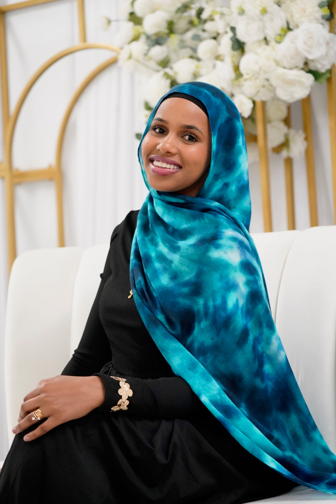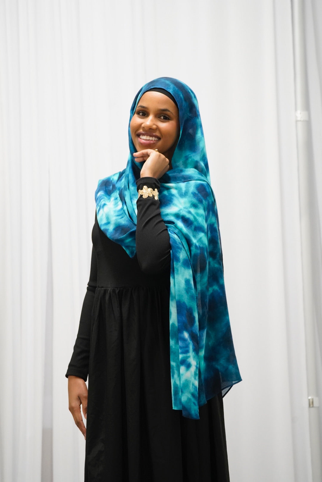 Feel Refreshed And Unstoppable With Ocean Breeze, A Hijab Designed To Channel The Calm And Power Of The Sea. This Piece Features Deep Ocean Blue, Teal, And Aqua Tie-Dye Patterns, Bringing Out A Cool, Serene Vibe Perfect For Any Occasion.
